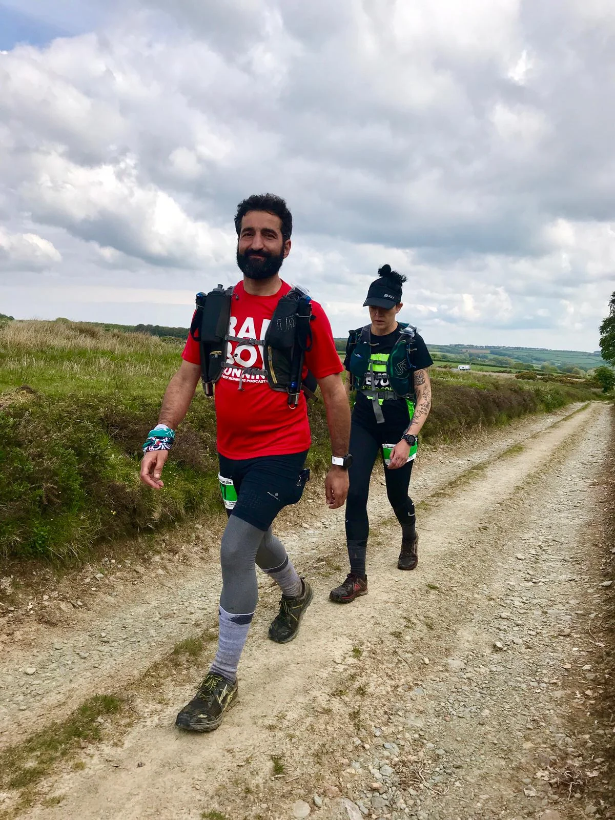 A quick word on the aid stations. Climb South West have the best people on their stations – everyone is brilliant, friendly, nice and helpful. But they don’t have a whole lot of food at them – so it’s advisable to think about that if you’re planning on doing this. There’s the usual – crisps, jelly babies etc but nothing really chunky apart from at the halfway point. I was hungry. It was morning and I didn’t want another fucking peanut butter sandwich. So I had some watermelon. This was the beginning of the end for me. I had made some stupid mistakes with kit and foot care and couldn’t deal with the fact that we had over 40 miles to go. I was losing my position mentally. Julius was doing well, and I felt like I was holding him back. I tried to encourage him to go on without me, but he wouldn’t. And I am glad he didn’t. But I felt like I was letting him down.