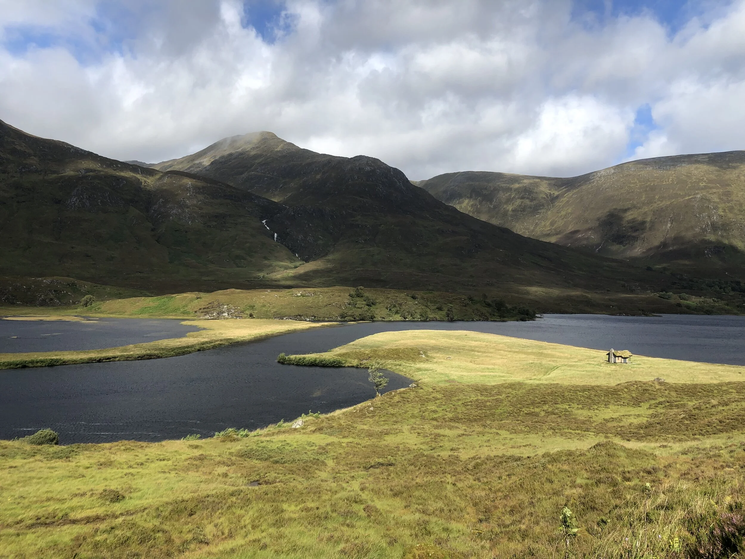 It was sunny now as we climbed towards the support vehicles. As the path rose, the water below us was lit up in multiple colours to reveal my favourite view of the trip. Loch Affric stretched out below us, and on the shore a tiny cabin with a grass roof, the roof blowing in the wind. I just stared at it. I just wanted to take it all in and never forget it. This is my views. The one I will take everywhere with me.