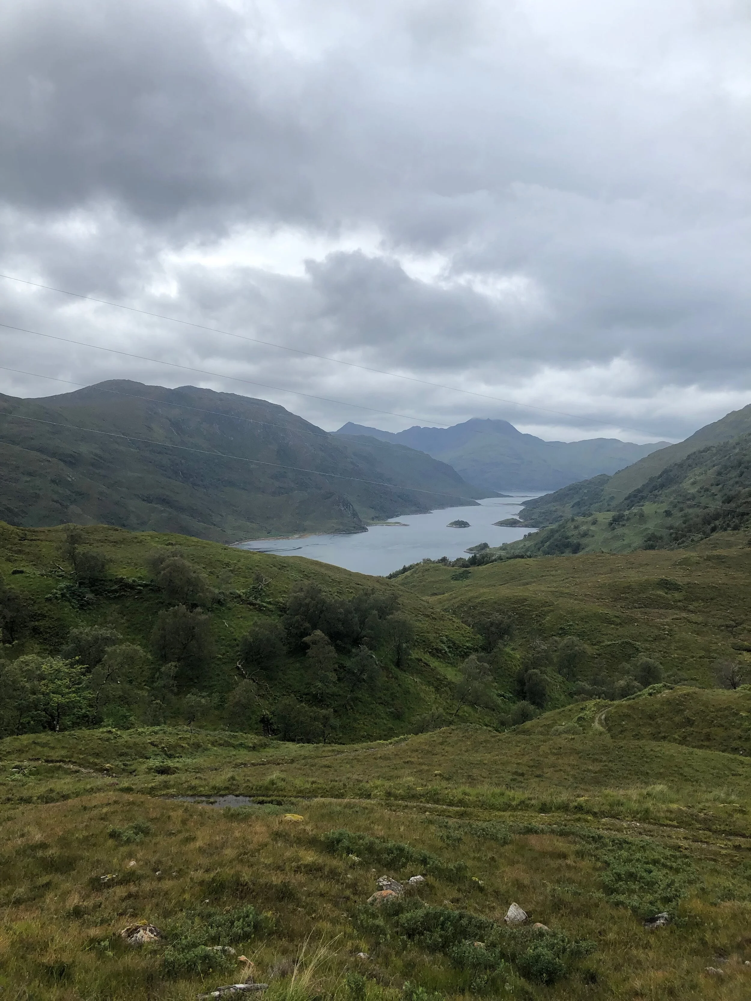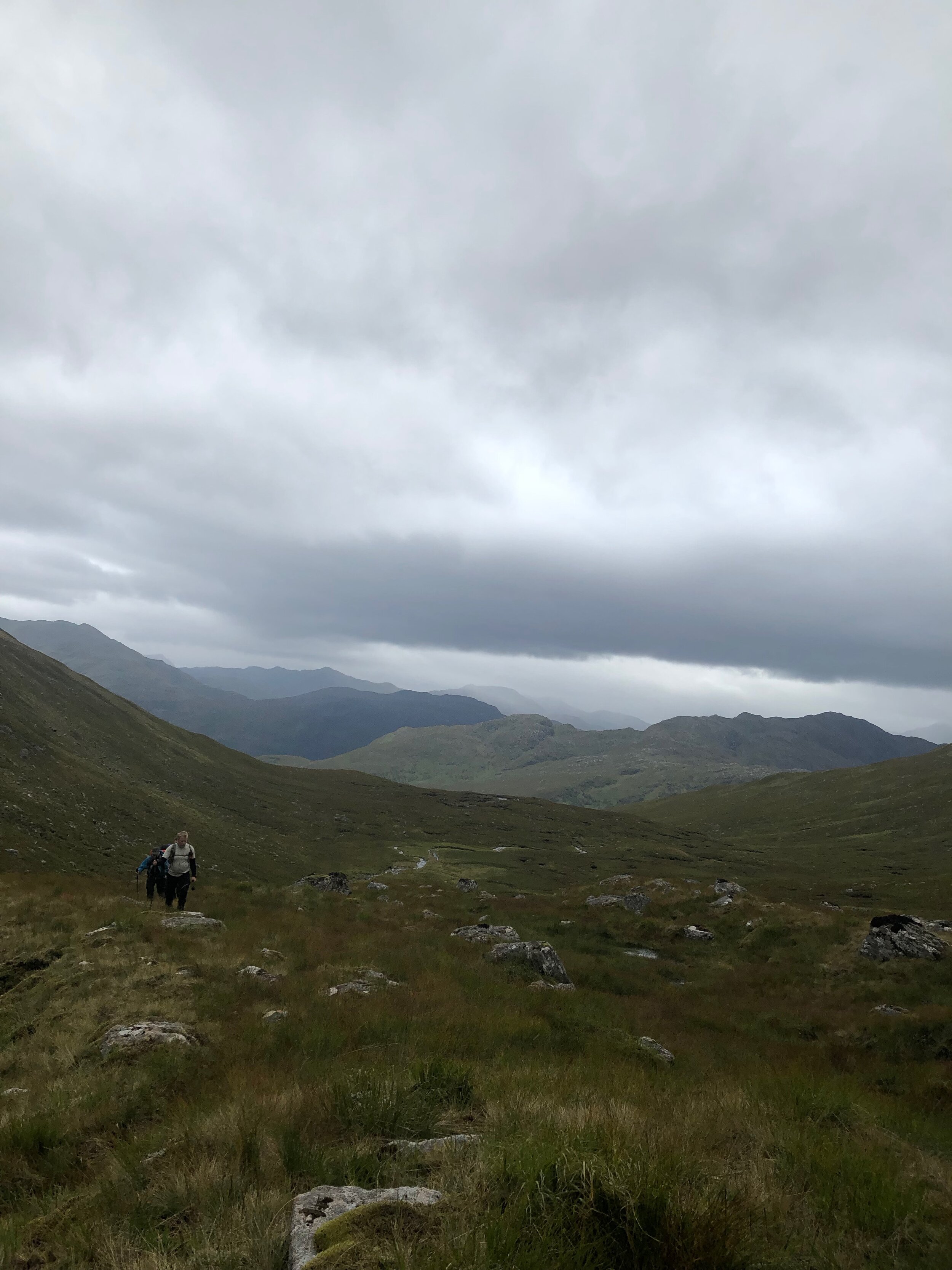 The ascent up began – we could see where we were headed. We were all making sure to drink enough water and snack, and we just kept on, heads down, up the mountain. We could see some weather. It was coming for us. We needed to get up and over before it swept in. Here are some views of some weather. And that ascent. The Loch in the pictures is the one we paddled in on.