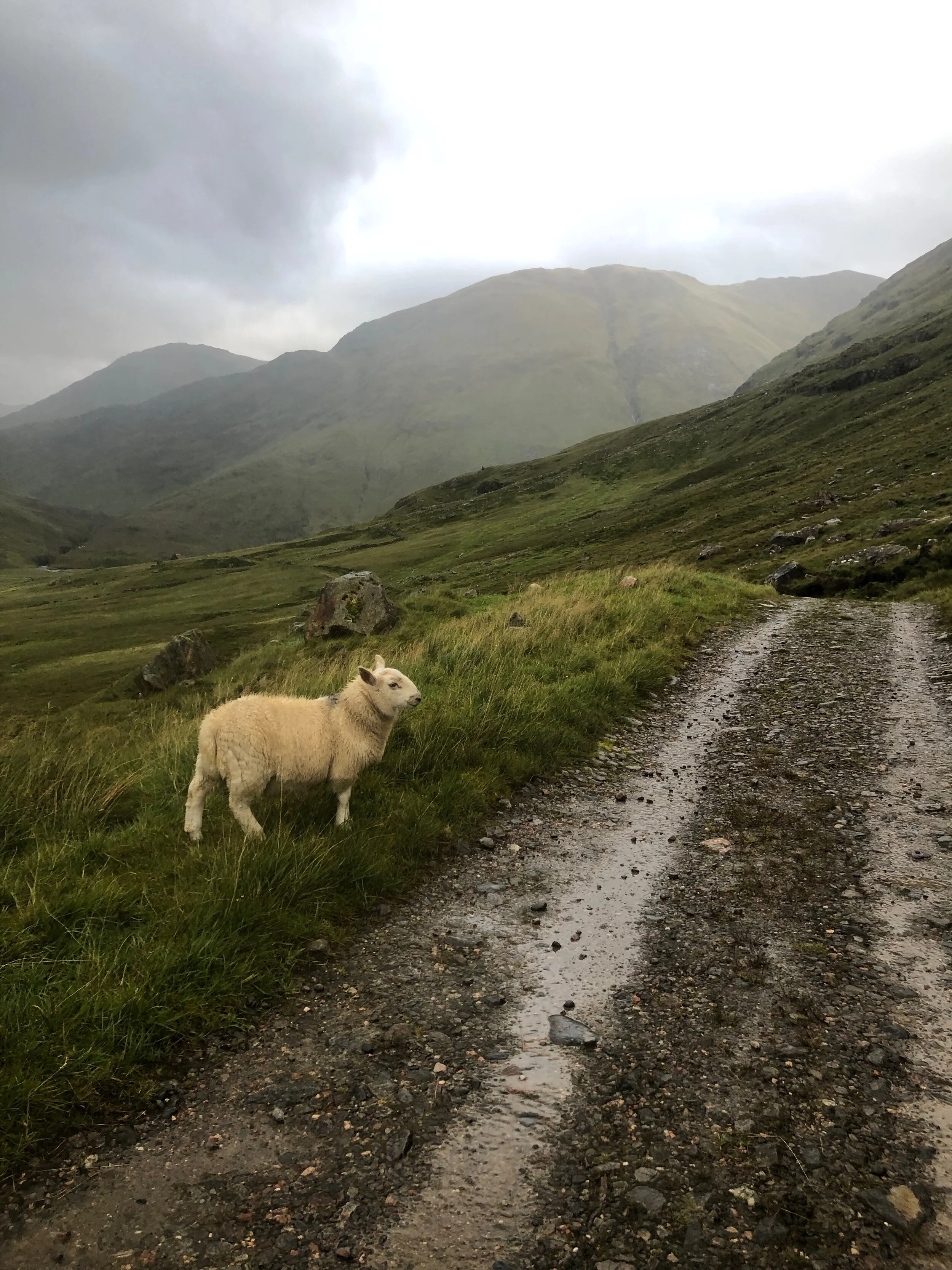 We set of at 6.02am. We were all in good spirits – a shower and a decent bed meant that we had rested and we were warm. We started out at a good pace, marching along the Kintail trail, back out into the wilderness of Scotland. This was my favourite day. It was equal parts brutal and beautiful. Four seasons in a day, over and over again. The rain swept across the hills – you could see it coming and going. The sun burst open onto spaces miles ahead only to be chased away by the 40 mph winds. Highland cows grazed and ignored us. Rain washed sheep stared at us in mock horror. It was heaven on earth.
