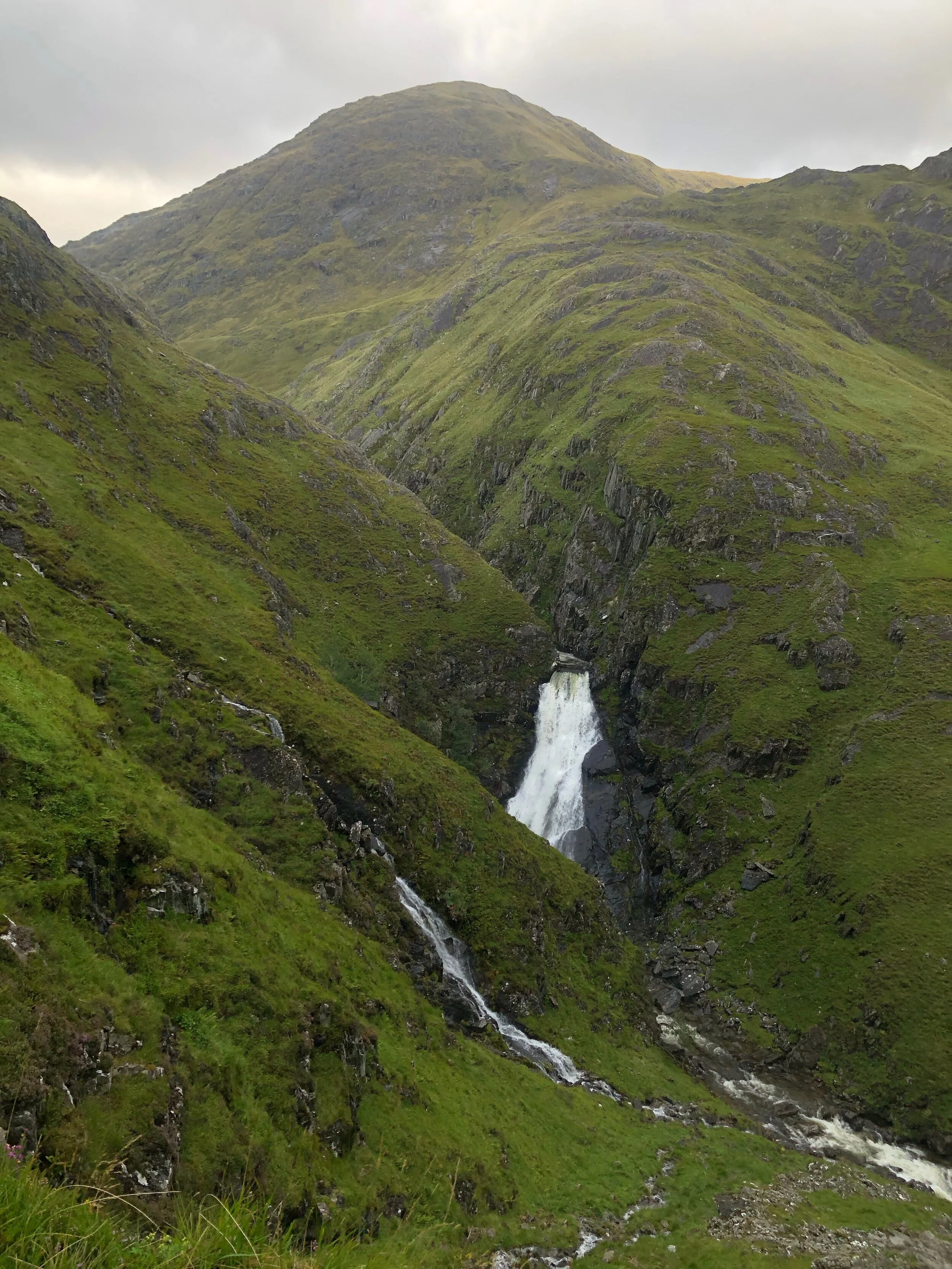 The wilds of Scotland opened up before us and it was more beautiful that I could have ever imagined. We trekked through huge waterfalls, the wind blowing the water up, on top and over us. We stopped in on an amazing little bothy about 8 miles in and ate snacks, all of us making plans to return and stay there one day. We hiked tracks that had turned to fast flowing rivers. We passed the most remote Youth Hostel in the UK, all of us willing it to be open to serve tea and coffee. It wasn’t. As the day progressed, the weather cleared. Rainbows lit up the sides of the Munros and we trekked along at a good pace, chatting and sharing stories, all of us overawed at the landscape, brutality and scale of Scotland at her best.
