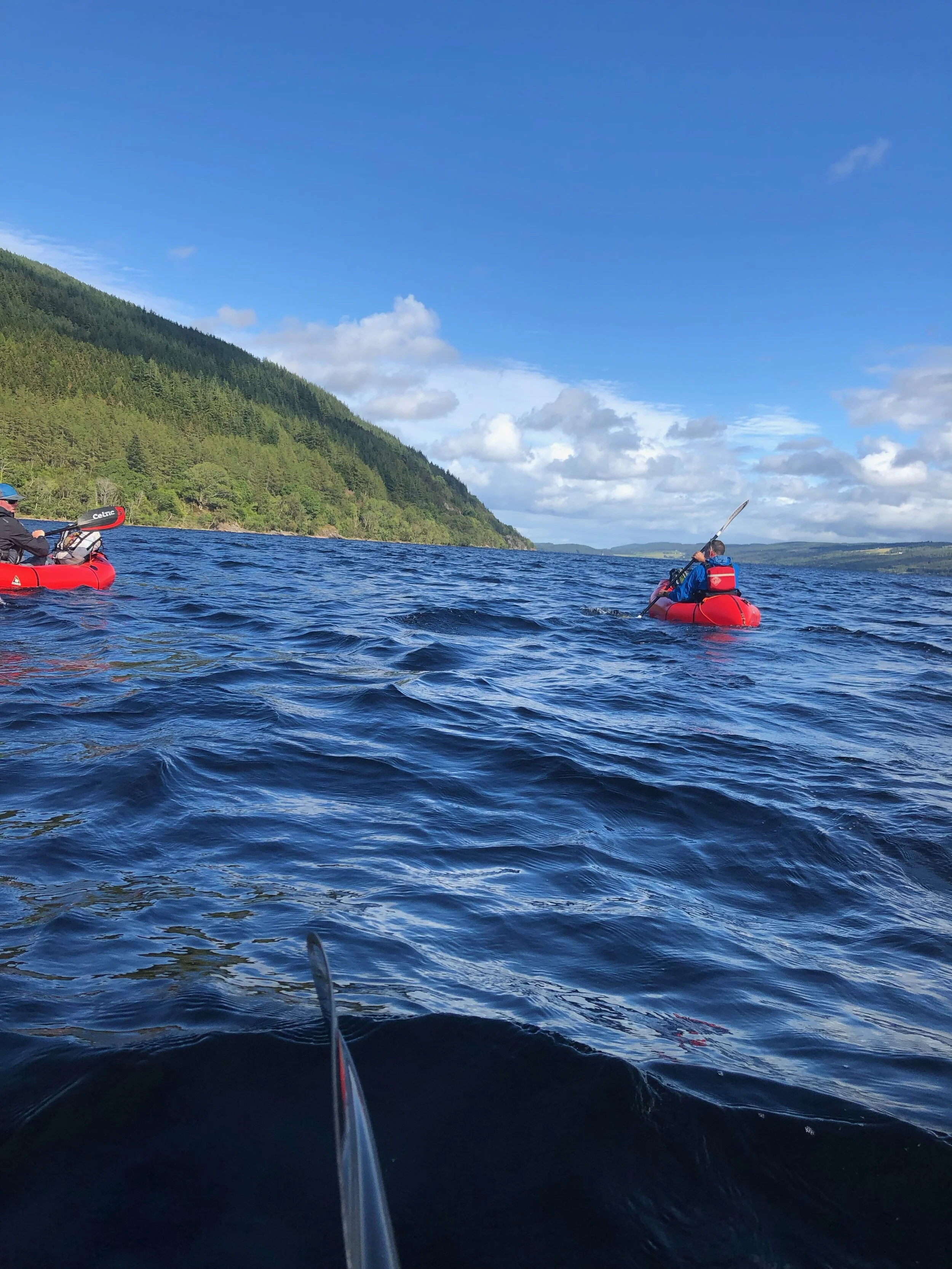 We got in, and after a quick fly by of Urquhart Castle, we started paddling east towards Inverness. We stayed close to the shore to allow the bigger boats and loch traffic space and minimise the wind. The wind was behind us, and even close to the shore that meant that we flew along. Some of the waves were pretty big – it was like being in the sea. I really wished I was technically good enough to be able to ride them properly. I just made do with my not-falling-out-strategy, one that I had been employing with great success for the last few days. Huge fish jumped out ahead of us and people gawped from the banks. It felt pretty epic, being allowed to raft down Loch Ness. It felt pretty special.